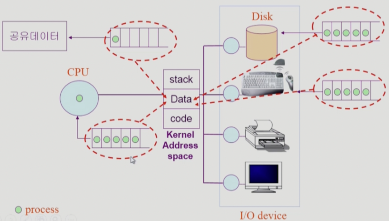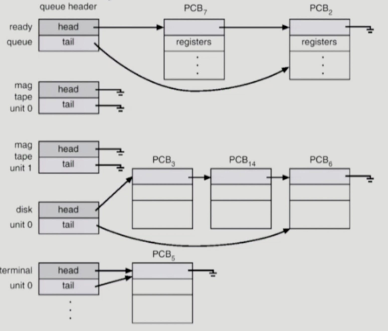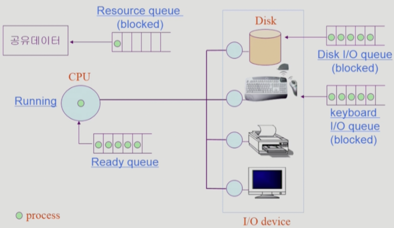 💡 프로세스들은 각 큐들을 오가며 수행된다. (PCB를 그 포인터를 사용해 연결 해놓는다)