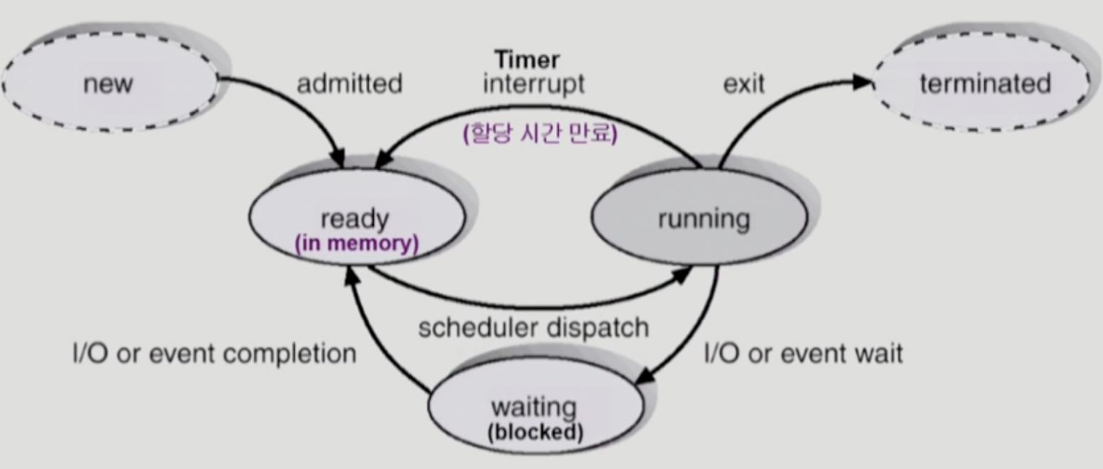- 프로세스는 아래와 같은 상태가 번갈아가며 수행된다.
