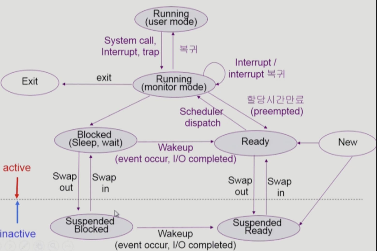 💡 Blocked: 자신이 요청한 event가 만족되면 Ready Suspended: 외부에서 resume해 주어야 Active그 외(일반적으론 위 4개로 나눔)
