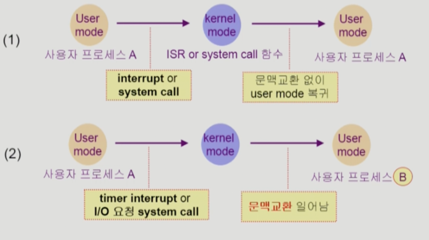 - System Call이나 Interrupt 발생 시 반드시 Context Switch가 일어나는 것은 아님