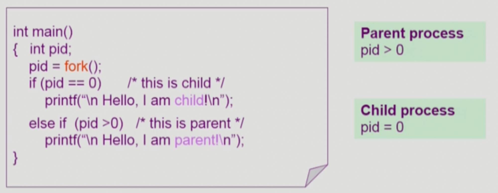 - 부모프로세스와 자식프로세스를 어떻게 구별할까? → 부모프로세스는 자식프로세스의 ID(PID)가 리턴결과로(양수) 나오고 자식프로세스는 0이 나옴