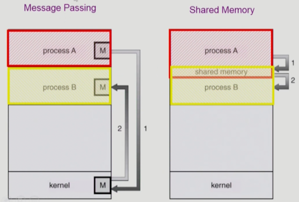 shared memory: 서로 다른 프로세스간에도 일부 주소 공간을 공유하게 하는 shared memory 매커니즘이 있음- 💡 thread: thread는 사실상 하나의 프로세스 이므로 프로세스 간 협력으로 보기는 어렵지만 동일한 process를 구성하는 thread간에는 주소 공간을 공유하므로 협력이 가능
