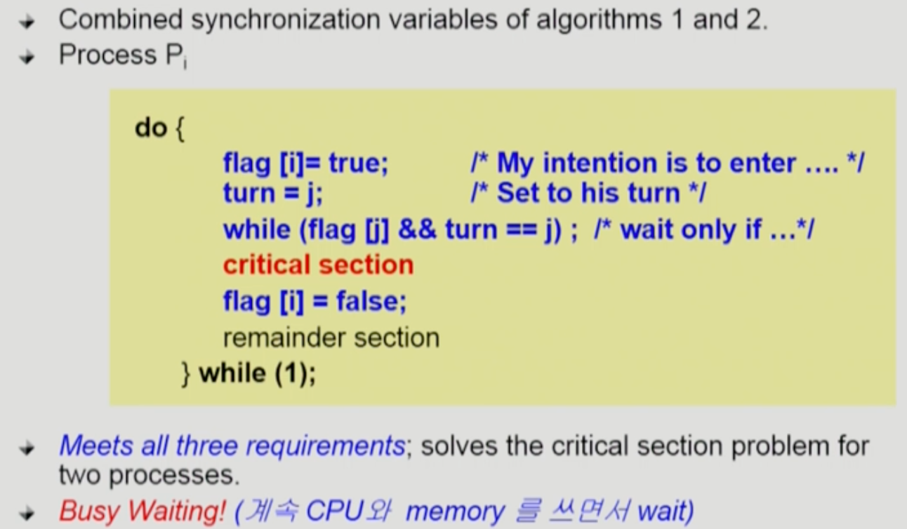 - 프로세스 Pi가 critical section 부분을 수행 중이면 다른 모든 프로세스들은 그들의 critical section에 들어가면 안된다.