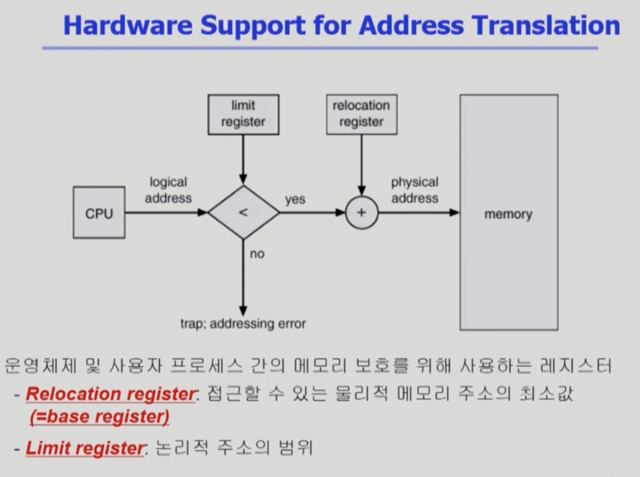 - relocation register: 접근할 수 있는 물리적 메모리 주소의 최소값