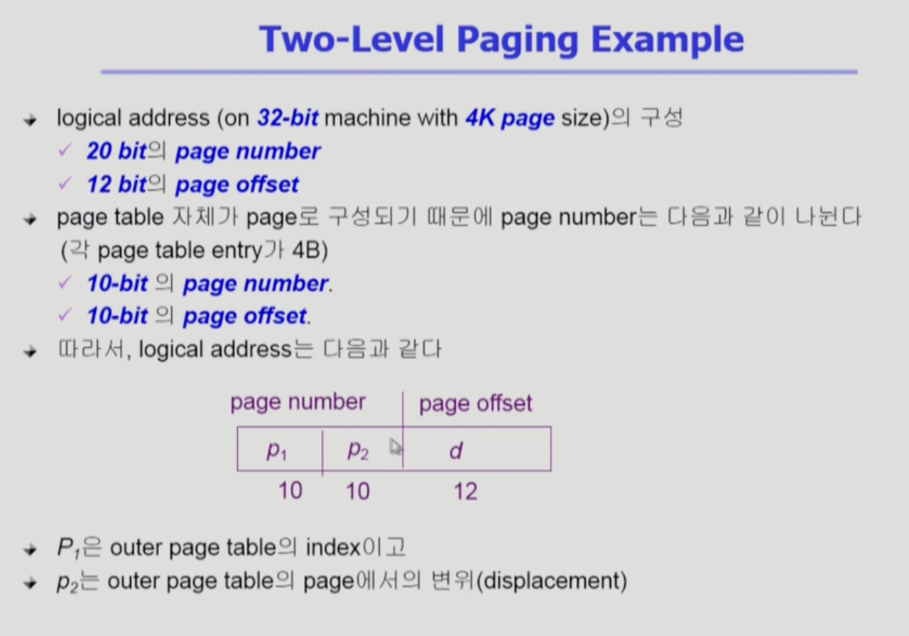 - 각 단계의 페이지 테이블이 메모리에 존재하므로 logical address의 physical address 변환에 더 많은 메모리 접근 필요(4단계 테이블을 사용하면 4번 접근해야 하므로 4배의 시간이 걸림)