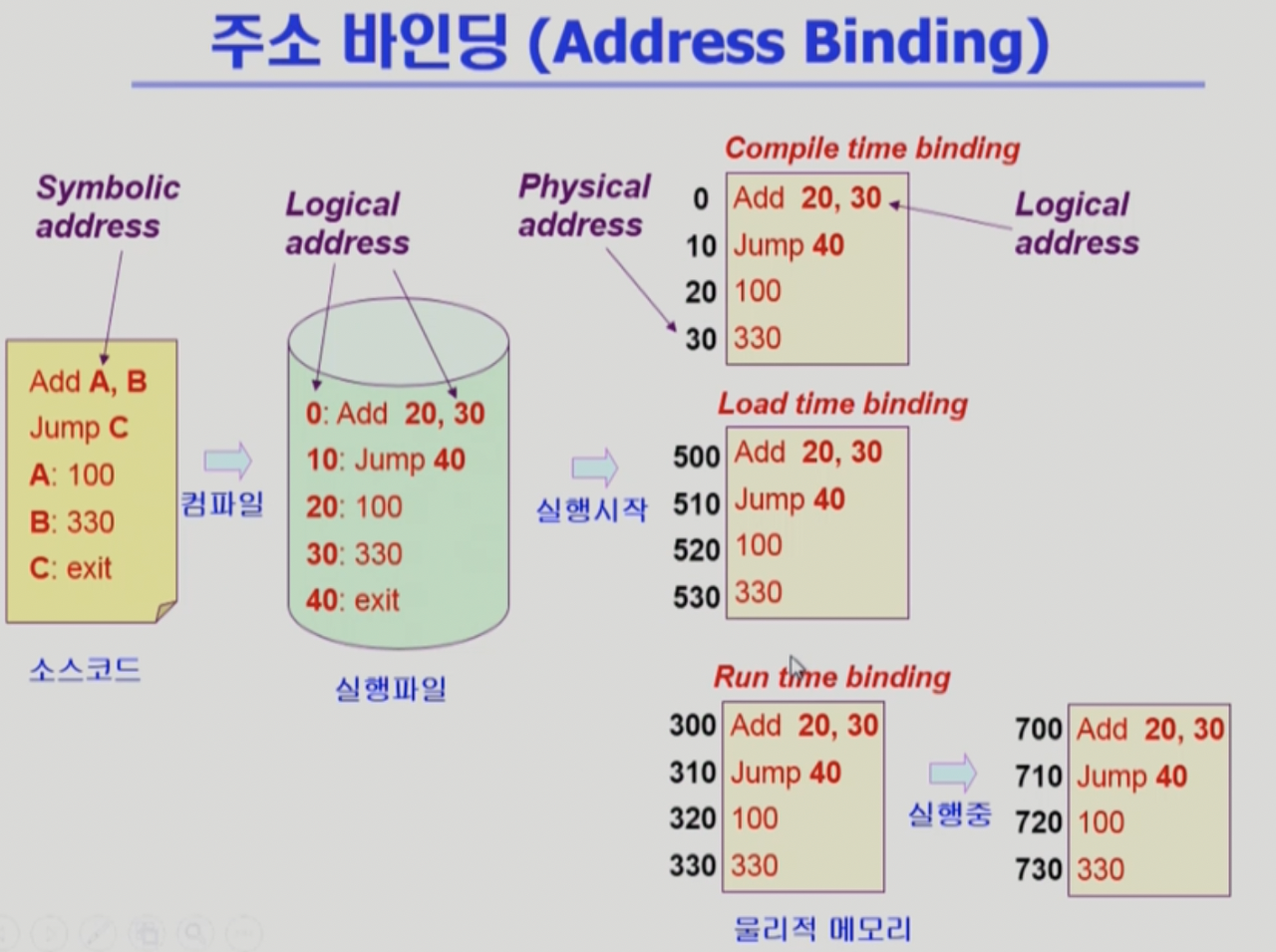 Symbolic Address(변수이름, 함수이름) → Logical Address → Physical Address