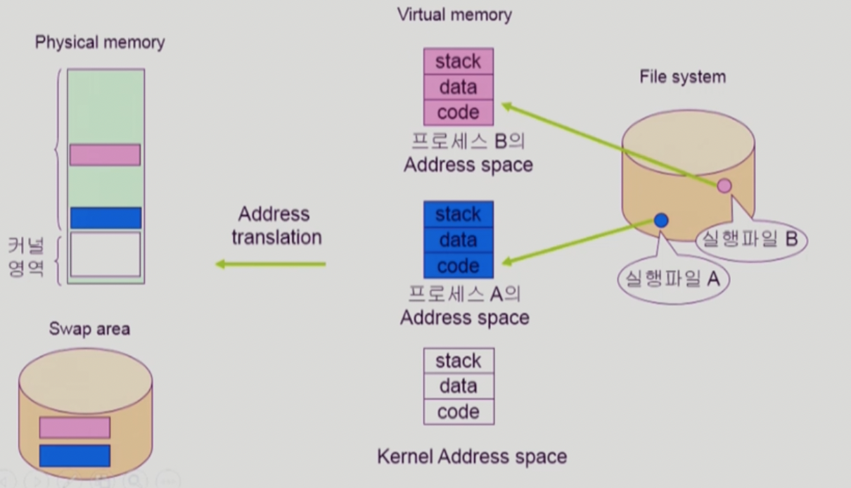 - code 부분은 swap영역으로 가는게 아니고 파일시스템의 실행파일에 파일의 형태로 존재함(memory-mapped I/O - Loader)