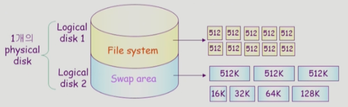 - 따라서 block의 크기 및 저장방식이 일반 파일시스템과 다름(예를들어, 밑의 그림처럼 일반은 512바이트, 스왑에어리어는 512 킬로바이트)