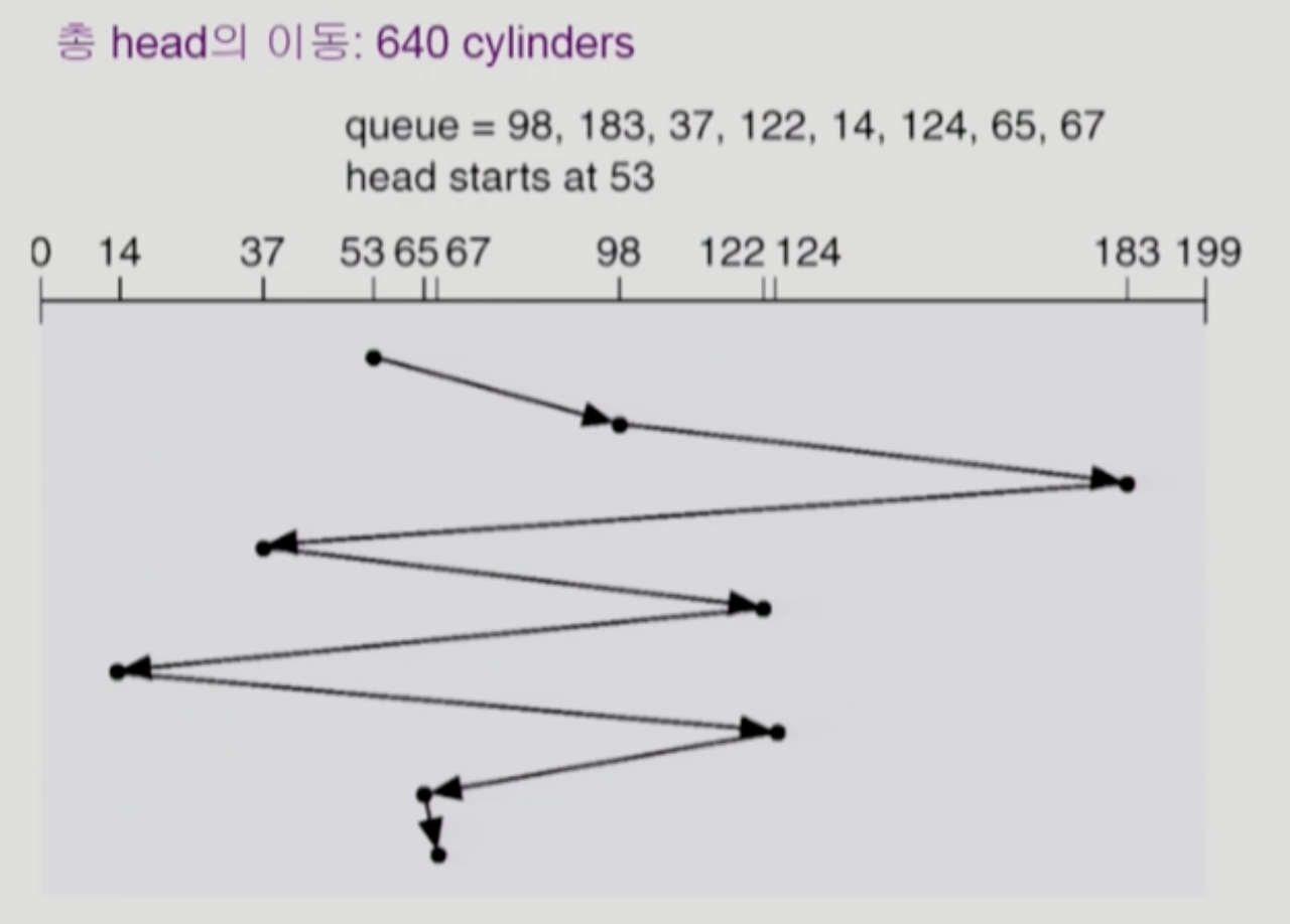 - File의 할당 방법에 따라 디스크 요청이 영향을 받음(연속할당을 했으면, 연속된 실린더 위치에 있어서 이동거리를 줄일 수 있는 등)